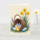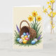 Designed with a gently tilted wicker basket in warm brown tones, the scene shows painted ovoid decorations spilling onto lush green foliage, with a cozy closeness that feels like friends leaning in to admire the find 🐰. Each ovoid is colored in cerulean, sunny yellow, soft pink, and lavender, and a few carry tiny dots or light swirling accents for extra detail. Behind the basket on the right, three large yellow blossoms open wide around textured orange centers, like they’re turning toward one another in a quiet, affectionate pose. On the left, slim spikes of small purple florets rise up and balance the composition, adding a cooler note beside the warmer flowers. A short holiday greeting sits near the top in a soft pastel shade, centered and easy to read against the creamy background 🌷. The lighting stays even and gentle, bringing out the weave of the basket and the soft edges of the leaves without harsh shadows. The basket’s rim is slightly angled, and several ovoids rest in a loose trail across the greenery near the lower edge.