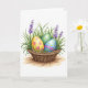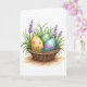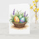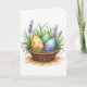 Designed with a woven basket at the center, this Easter card brings a fresh spring scene to life with soft detail 🌷. Three decorated eggs rest together in a nest of green grass and small purple flowers, leaning close like old friends sharing a quiet moment 🐰. One egg is sunny yellow with pink floral shapes, another is teal with scattered yellow dots, and the third is light blue with yellow dots and a purple band across the middle. The basket’s braided texture contrasts with the smooth eggs, and the grass curls around them in a way that feels gently protective. A white background keeps the focus on the basket and makes the colors stand out without feeling busy. The greeting text sits above the basket in a simple, medium-weight purple font, with a smaller line of text placed below in matching color. A faint shadow falls under the basket, and tiny purple blossoms peek out along the lower edge of the grass.