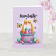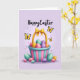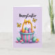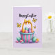 This greeting card features a sturdy basket with teal vertical stripes and soft pink accents, topped by an arched handle tied with a shiny golden bow that feels like a sweet gift between close friends 🌷. Inside and around the basket, pastel ovoids in mint green, orange, gentle pink, and soft purple nestle together as if gathered with care. Several of the ovoids have faint horizontal lines that add texture and make the cluster look thoughtfully arranged. The background is a calm lavender field that sets a tender, easygoing mood, like a quiet moment shared side by side 🐰. Small starburst sparkles are scattered around the scene in light, complementary tones, giving the space a soft twinkle. Near the top, the words “Happy Easter” appear in flowing lettering, set in a deep purple tone and centered above the basket. Three yellow butterflies with dark-outlined wings drift across the upper area, spaced apart against the lavender backdrop.