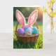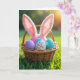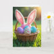 Designed with soft late-afternoon golden light, this Easter card features a woven brown basket resting in thick green grass, with the scene framed low to the ground for an intimate, close-up feel 🌷. Inside the basket sit smooth pastel eggs in lavender, rose pink, and robin’s-egg blue, their gentle colors leaning toward a sweet, friendly mood. One white egg stands out with red polka dots and thin gold stripes, adding a little sparkle without looking flashy. Just behind the basket, a pair of long, fuzzy ears rises into view 🐰, their pale pink inner lining catching the light like a shy companion leaning in. The warm rim-light creates a soft halo around the ears, as if the hidden bunny is sharing a quiet moment with whoever discovers the basket first. Text appears at the top in a simple, easy-to-read font, set in a light brown tone that matches the basket and doesn’t overpower the photo. In the background, sun-dappled leaves blur into glowing circles while individual blades of grass in the foreground glisten beside the basket.