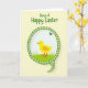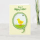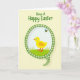 This greeting card features a bright yellow baby bird with wide blue eyes and a tiny orange beak and feet, standing on a small patch of green grass as if waiting for a friendly hello 🐰. The bird sits inside a speech-bubble-shaped frame trimmed with a green-and-white gingham pattern, giving the scene a cozy, picnic-day look. Above its head, a small striped flying insect with pale blue wings hovers close, like a gentle companion keeping it company 🐇. The background is a soft, creamy yellow wash that makes the central figures feel warm and approachable. At the top, a short seasonal greeting is placed in green lettering, centered and easy to spot. The bird’s forward-facing stance and the insect’s nearby flutter create a tender, togetherness moment that reads like friendship in motion. The gingham border adds texture around the scene while keeping the focus on the bird and the little visitor. The frame’s rounded tail points downward toward the grass, with the green checks alternating neatly against white.