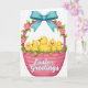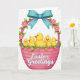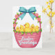 This design shows a deep pink woven basket centered on the card, drawing your eye upward from the base where small white cursive-style lettering sits neatly along the lower front. Inside the basket are five fluffy yellow little birds with tiny orange beaks and round black dot eyes, each one angled slightly toward the others as if sharing a friendly, affectionate moment. Soft green grass peeks up around them, adding a fresh spring setting that feels gentle and close. The curved handle is decorated with a garland of small five-petaled pink flowers with yellow centers, tucked between light green leaves and a few curling stems 🌷. At the top, a glossy sky-blue bow is tied with smooth folds that contrast nicely against the warm pink and yellow tones. The lighting looks softly diffused, giving the basket weave, petals, and feathers a mild sense of depth without harsh shadows. The message text stays low and subtle in white, letting the birds and floral trim carry most of the attention 🐰. Above the flowers, the blue bow’s loops and trailing ends sit centered on the handle, with crisp edges and gentle highlights.