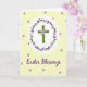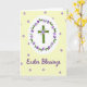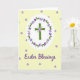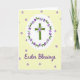 This design shows a botanical cross formed from fresh green reeds, standing tall at the center like a gentle promise of springtime renewal 🐇. Around it sits a round garland of leafy greens dotted with small purple blossoms, arranged as if carefully placed by someone thinking of a loved one. Tiny white flowers cluster near the cross’s middle, adding a soft highlight that feels like a quiet, affectionate touch. The whole emblem rests inside a bright white oval that draws your eye in and gives the centerpiece a calm glow. Behind it, a creamy yellow background is sprinkled with small five-petal purple flowers, repeating the same shade as the wreath for a cozy, connected look 🌷. Near the bottom, the words “Easter Blessings” appear centered beneath the oval in purple lettering, standing out clearly against the light background. The greens and pastels balance each other, and the close, tidy spacing of the wreath and cross suggests a tender closeness rather than a grand display. Small purple flowers are scattered evenly across the yellow backdrop like confetti in a gentle spring breeze.