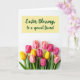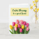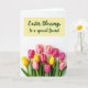Designed with a bright white background, this card features a dense row of tulips along the bottom edge, creating a garden-like base that feels inviting 🌷. The flowers mix deep magenta, soft blush pink, peach-tinted petals, and sunny yellow blooms, with green stems and leaves layered closely together. Above the tulips sits a wide rectangle of creamy yellow, like a gentle panel of morning light. Centered on that yellow area is the message “Easter Blessings to a special friend” in flowing deep green lettering, sized large enough to be the main focus. Soft, diffused lighting adds mild shadows under petals and leaves, giving the bouquet a tender, almost shared-between-friends closeness. Plenty of open white space around the design keeps the scene airy, while the tulips look freshly gathered, as if offered with a quiet smile 🐇. The bottom band is packed with cupped tulip heads in alternating pinks, magenta, and yellow, with overlapping green leaves forming a thick border.