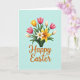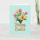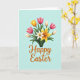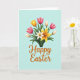 Designed with a soft blue background that fades gently from lighter in the center to deeper at the edges, this card frames a spring bouquet as the main focus. In the middle, pink, yellow, and creamy white tulips rise together, some opening as if leaning toward one another like close friends, while others stay neatly closed. Green leaves and sturdy stems weave through the arrangement, creating a cozy, gathered look that feels like an armful offered with care 🌷. Two lilies sit near the center, one white and one golden yellow, their petals spread wide with fine, pollen-dusted stamens for added detail. Beneath the flowers, the words “Happy Easter” are placed along the lower portion, drawn in a flowing, hand-lettered style. The text is colored a warm orange-brown, with rounded curves and thick strokes that balance the airy background and the lush greens. Tiny highlights along the petals and the soft gradient behind the bouquet give the scene a gentle glow, while the tulips and lilies stand tall above the message 🐰.