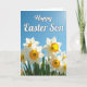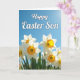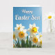 Designed with a springtime scene, this card shows a cluster of white, trumpet-shaped flowers with ruffled orange-yellow centers stretching across the lower portion, rising from lush green leaves. The blooms lean toward each other as if sharing a quiet moment, giving the arrangement a gentle, friendly closeness 🌷. Above them, the top third opens into a deep blue sky that feels wide and sunlit. A soft glow in the upper right corner suggests sunlight brushing the scene, like a warm glance between close companions. The greeting text sits over the sky in the upper area, written in flowing white lettering that stands out clearly against the blue. The foreground petals and frilled cups are shown with crisp detail, while the background fades slightly to add depth and calm. Small touches of orange and yellow repeat from flower to flower, guiding the eye across the row like a shared path. A tiny 🐇 can be tucked near the greenery at the bottom edge, framed by the bright blooms and the open sky.