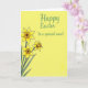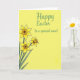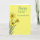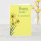 This card features a sunny spring illustration with three stylized golden-yellow blossoms gathered in the lower-left area, like a small bouquet offered with gentle affection 🌷. Each flower has softly shaded petals outlined in thin black lines, and a deeper amber-orange ruffled center that adds texture and warmth. Slender emerald-green stems and pointed leaves angle upward, creating a diagonal path that feels like a sweet gesture reaching toward someone special. The background is a strong lemon-yellow wash that makes the greens and golds stand out and keeps the scene bright and friendly. In the upper-right, a flowing cursive-style greeting appears in soft jade green, spaced with plenty of open room around it. The lettering sits high and slightly to the right, balancing the bouquet below and suggesting a quiet, close connection, like a note meant for one dear person 🐇. The flowers sit low and left while the green message floats above on the right, all set against the uninterrupted yellow field.