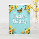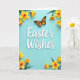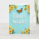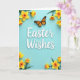 Designed with a springtime look, the card features a calm aqua background that feels like open sky over a garden bed. In the center, flowing white lettering with a faint shadow sits as the main message, with the words spaced evenly to invite a lingering glance. Around the edges, a ring of golden flowers frames the scene, their yellow petals curling around orange centers like little cups, with deep green stems weaving between them. Some blooms are wide open while others are still buds, creating a gentle “just-picked” rhythm that suggests someone arranged them with care for a friend. Above the central words, a butterfly hovers as if drawn in by the message, its wings painted in warm orange with black veins and small white and yellow touches along the tips 🐇. Soft, diffused light smooths the textures so the petals and wings look tender rather than sharp, like a quiet moment shared between two people. A few tiny gaps in the floral border let the aqua background peek through, and a small 🌷 detail sits near the lower edge beside the white center text.