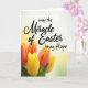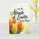 Designed with a springtime look, the card features a full bouquet of blossoms filling the lower half, with sunny yellow flowers mixed with petals that fade from orange into soft red. The flowers sit close together like a shared bunch, their slightly opened petals leaning toward one another in a way that feels like a gentle embrace 🌷. Deep green stems and leaves anchor the arrangement, adding cool contrast to the warm blooms. Near the top, a short Easter greeting appears in dark lettering, centered and easy to read against the light background 🐇. The background stays softly blurred, shifting from mellow yellow near the top into a pale green wash below, like morning light in a garden. Tiny specks of light float around the upper area, giving the scene a soft sparkle. The text sits above the bouquet while the warm-to-cool gradient glows behind it, and the petals show faint texture along their edges.