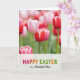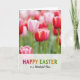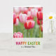 This design shows a close-up spring garden scene where one elegant flower takes center stage, its cupped petals fading from soft white into a gentle blush pink, with fine lines that look like satin threads. Nearby, clusters of matching blooms gather close as if keeping each other company, mixing deep reds edged in white with rosy pinks and magenta tones that suggest a sweet, friendly closeness. The background melts into a soft blur, turning distant petals into smooth washes of color that feel like a quiet backdrop to the main bloom. Light is diffused and tender, brightening the petal edges and bringing out fresh greens in the slim upright stems below. Along the bottom, a semi-transparent band stretches across the image, giving the design a calm place for the message without covering the flowers. Centered on that band is a cheerful “Happy Easter” greeting in multicolored lettering, easy to read against the pale overlay, with a small 🌷 accent nearby. The overall palette stays gentle and springlike, letting the flowers’ colors do most of the talking while the text sits neatly below. In the foreground, the main flower’s pink-tipped petals curl slightly inward, framed by red-and-white blossoms and soft green stems, with a tiny 🐰 tucked near the lower edge.
