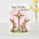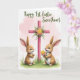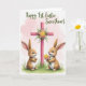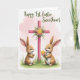 This card features a stylized pink wooden cross at the center, trimmed with yellow daisy-like blooms, small pink roses, and leafy green sprigs 🌷. Two long-eared animal characters stand on either side in a balanced layout, their bodies angled inward as if sharing a quiet moment together. The left character has warm brown and creamy white fur with rosy cheeks and wide eyes, gently holding a small bouquet as though offering it to the other. The right character faces the gift with an easy, welcoming stance, creating a tender, friendly exchange without needing any extra cues 🐰. Soft, diffused lighting and pastel tones fill the scene, with a blush-pink wash near the top fading into white for an airy backdrop. Near the top, a short greeting appears in green lettering, centered above the cross and echoing the greenery in the flowers. Along the bottom edge, bright green tufts of grass form a simple base beneath the characters and the cross.