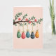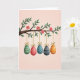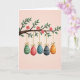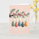This design shows a spring scene with a gently curving tree branch in earthy brown stretching across the top, dotted with fresh green leaves and soft pink blossoms with yellow centers 🌷. Hanging beneath the branch are five egg-shaped ornaments, evenly spaced as if they’re keeping friendly company in a neat row 🐰. Each ornament is held by a thin golden string that ends in a small bow near the branch, adding a tender, gift-like touch. The first two eggs are teal and red with small white dots, while the next three are deep green, midnight blue, and tangerine orange with creamy horizontal stripes. The background is a smooth pastel pink wash that makes the colors stand out without feeling busy. There is no visible text on the front, leaving the artwork centered and open with plenty of breathing room around the hanging eggs. Subtle shading and light texture give the branch, blossoms, and ornaments a softly painted look, with the golden strings catching a gentle highlight against the pink backdrop.