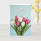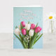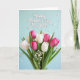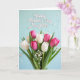 This greeting card features a full, fresh bouquet of spring tulips filling the lower two-thirds of the front, with white blooms nestled beside rich fuchsia ones like close companions leaning toward each other ❤️. Broad green leaves wrap around the flowers, adding depth and a grounded, natural contrast. Small sprays of tiny white filler blossoms dot the arrangement, giving it a light, airy texture like soft little sparks among the petals. The background is a gentle pastel blue with faint white polka dots that fade into a slightly blurred distance, creating a calm, dreamy setting. A few out-of-focus white specks float across the scene, like drifting petals or confetti caught midair 🌼. Near the top, the greeting text sits centered in a flowing style, outlined in soft pink to echo the brighter tulips below. The bouquet looks freshly gathered and carefully arranged, with the tulip heads mostly closed and angled in different directions for a natural, layered look. The upper area stays open and airy, while the tulips cluster densely at the bottom against the dotted blue backdrop.