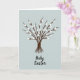 This card features a soft blue‑gray background that feels like open spring air, with a gathered bundle of slender dark-brown branches fanning upward as if leaning together like close friends. A darker cord ties the stems near the base, adding a cozy, rustic touch that hints at a shared gesture of care. Along each branch sit many small, oval, off‑white buds that resemble early spring catkins, their plush look creating a gentle contrast against the sharper twigs 🌷. The simple palette keeps the focus on the tender pairing of rough wood and soft buds, like a quiet romance in nature’s details. Near the lower portion, a short greeting appears in flowing, cursive-style lettering, set in a deeper gray-brown that echoes the branches without stealing attention. The text is centered beneath the botanical cluster, leaving plenty of breathing room around it for a calm, airy layout 🐇. The buds are spaced in neat rows along the twigs, with the highest tips reaching toward the upper edge while the tied base sits just above the bottom margin.
