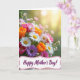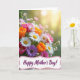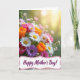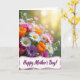This greeting card features a lush spring bouquet filling the frame, arranged to feel like a warm hug shared between close hearts ❤️. Orange tulips stand out beside soft pink blossoms, crisp white daisies with sunny yellow centers, and a single rich purple flower that adds a romantic contrast. The close-up view pulls you into the petals and stems, as if you’re leaning in to admire a fresh gift just handed over with a tender smile. Light streams in from the upper right, laying a gentle glow across the flowers and softening the background into a green blur with tiny out-of-focus highlights. Near the lower center, a decorative banner frames the message “Happy Mother’s Day!” in dark lettering that’s easy to read against the light border. The text sits neatly within the banner, letting the blooms remain the main focus while still making the greeting clear 🌼. Behind the bouquet, the greenery fades into a smooth bokeh that keeps attention on the orange, pink, white, and purple petals in front.