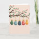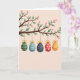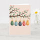 Designed with a spring tree branch stretching across the top, the scene shows fresh green leaves and soft pink blossoms against a muted peach background 🌷. Hanging from the branch are five egg-shaped ornaments, each tied with a small golden bow and a thin gold hanger that feels like a gentle gift between friends 🐰. From left to right, the first is deep green with neat white horizontal bands, followed by a pale blue one decorated with stripes and tiny dots. Next comes a dark navy egg sprinkled with small golden specks, then a bright red egg covered in white polka dots that reads like a flirty wink. The final egg is warm orange with smooth white stripes, rounding out the row like a friendly handhold at the end. The colors are softly blended with a watercolor-like texture, and the light stays even and calm, keeping the focus on the tender, close spacing of the hanging decorations. There is no text on the front, leaving the open peach space below the branch ready for a message, while the gold hangers and bows add a subtle shine near the top edge. The branch sits near the upper border, with the five ornaments dangling in a gentle line at slightly different heights beneath the blossoms.