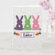 Designed with three stylized rabbit silhouettes across the top, the card sets a friendly, affectionate tone as if the little group is posing together 🐰. The left rabbit is a deep plum, the center rabbit is bright lime green, and the right rabbit is soft blush pink, creating a sweet contrast against the white background. A small white star-shaped flower sits on each rabbit’s back, and the two outer rabbits also have tiny blossoms near their feet, like they’re bringing gifts for one another 🌷. The white backdrop isn’t flat, showing raised, flowing curls and leaf-like shapes that catch light and add gentle depth. Beneath the rabbits, a white banner stretches across the lower area with a festive message printed in deep purple lettering. On both ends of the banner, two orange root vegetables angle inward with leafy green tops, framing the words like a shared little secret between friends. The overall layout is neatly layered, with smooth cutout edges standing out against the textured white surface and the purple text centered on the banner. The final detail is the pair of orange root vegetables flanking the banner, each with bright green leaves pointing upward.