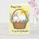 This greeting card shows a fluffy white long-eared bunny 🐰 curled up asleep in a rustic woven basket, its rosy cheeks and relaxed face giving it a tender, cared-for look. Around the basket, small blossoms in soft blue, pink, purple, and sunny yellow mingle with slim green leaves, as if someone gently tucked spring flowers close for company 🌷. A golden-yellow bow is tied neatly to the braided handle, catching the light and adding a cheerful accent. The background is a warm, pale yellow with a faint textured grain that keeps the scene cozy and bright. At the top, a seasonal greeting appears in flowing lettering in a darker tone that stands out against the light backdrop. Near the bottom, a short dedication line sits centered beneath the basket in a matching color, framing the illustration without crowding it. Soft, diffused lighting adds gentle highlights to the bunny’s fur and a slight sheen to the petals. The flowers spill over the basket’s edge in a loose arc, with the bow angled slightly to the right.
