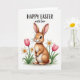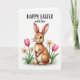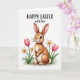 This card features an illustrated bunny 🐰 with tawny brown fur and a creamy white belly, sitting calmly and looking slightly to the left with a tender, friendly gaze. Its tall ears show a soft pink inner tint, and a tiny rosy nose and fine whiskers add gentle detail. Around the bunny, spring flowers gather close as if keeping it company, with two pink tulips opening beside several white daffodils with warm yellow centers 🌷. The stems and leaves are a fresh green, rising from a small cluster at the bottom while the background stays bright white to keep the scene airy. Near the top, a seasonal greeting is placed in dark lettering, centered above the illustration so it feels like it’s speaking down to the little figure. The soft, watercolor-like shading gives the bunny and blossoms a cozy closeness, like a quiet moment shared between friends. The greeting text sits above the bunny in dark ink, with the flowers clustered at the lower edge and the bunny nestled between the tulips and daffodils.
