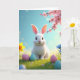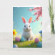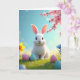 This card features a small white bunny 🐰 with soft fur and pink-lined ears, lit by gentle daylight that makes its dark, curious eyes stand out as it looks straight ahead. It sits low in a bed of rich green grass, close enough to feel like you’ve wandered into its little corner of spring. In the foreground, several pastel egg-shaped decorations in pink and turquoise rest among the blades, their delicate patterns adding a sweet, shared-day-out feeling, like something two friends tucked away together. A short Easter greeting appears near the top in light pink lettering, centered and easy to read against the sky. Above the bunny, thin branches curve inward with clusters of pale pink blossoms 🌷, framing the scene like a soft canopy. Small yellow and blue flowers dot the ground around the eggs, adding gentle color contrast without stealing focus. The background fades slightly into a smooth blur while the closest eggs and the bunny’s face stay crisp, and the sky behind the blossoms is a bright, clear blue.