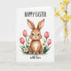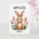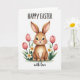 Designed with a springtime illustration, the card centers on a sweet, rabbit-like character in warm brown and soft cream, with fluffy fur details and bright eyes that seem to linger on the flowers like a friendly companion 🐰. A small smile and rosy cheeks give it a gentle, affectionate look, as if it’s quietly sharing the moment with someone close. From a green base, matching stems and leaves rise on both sides, framing the character in a balanced garden setting. Pink tulips with softly closed petals climb upward, adding a calm, romantic touch like flowers set aside for a special friend 🌷. White daffodils with sunny yellow-orange centers are tucked between the tulips, bringing little sparks of light to the arrangement. The background stays plain white, letting the pastel tones and soft, watercolor-like shading stand out without distraction. A short greeting appears along the top edge in a dark gray, flowing style, with a smaller line of text echoed near the bottom. The tulips and daffodils curve inward toward the center, their stems forming a gentle arch around the rabbit.