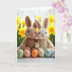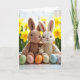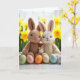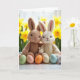 This card shows a close-up spring scene with two plush toy rabbits sitting snugly side by side, their bodies angled toward each other like close friends sharing a quiet moment 🐰. One rabbit is warm brown and gently leans into a lighter, creamy companion, and both have pink noses, stitched smiles, and large glossy eyes that seem to meet with a tender look. In front of them, pastel decorative eggs are arranged in a small cluster, with soft speckles and tiny dots in pale blue, mint green, peach, and blush. Behind the pair, sunlit yellow daffodils rise in a loose bouquet, framed by deep green leaves that soften into the background. The lighting is diffused and golden, creating a faint halo around the flower petals while keeping the rabbits and eggs crisp in focus. The greeting text sits near the top in a gentle gray tone, with a smaller line below it in light pink, leaving open space around the rabbits 🌷. The daffodils’ trumpet-shaped blooms glow against the blurred greenery, while the eggs’ subtle patterns peek out along the lower edge of the scene.