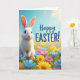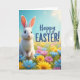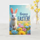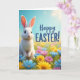This card features a white rabbit resting on the left, its soft-looking fur and dark, gentle eyes turned outward as if inviting a quiet moment of friendship 🐰. Around it spreads a thick bed of spring flowers across the lower part of the scene, with bright blues, rosy pinks, and warm yellows layered like a natural blanket. The rabbit’s ears show a light blush inside, and its fine whiskers are drawn with careful detail, adding a tender, attentive expression. On the right side, a cheerful Easter message sits in large lettering, set in a sunny color that stands out clearly against the sky. Above, the background opens into a calm blue sky with a smooth gradient from aqua to deeper blue, giving the scene airy space. Some foreground petals soften into a gentle blur while the rabbit remains crisp, creating a cozy, intimate focus like two friends sharing a quiet spring morning 🌷. The flowers cluster thickest along the bottom edge, with scattered blossoms reaching toward the rabbit’s paws.