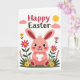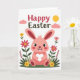 This card features a stylized pink bunny 🐰 centered on a bright white background, sitting upright with long ears, dark shiny eyes, and soft rosy cheeks. It holds a crisp white heart close to its chest, like a quiet gift shared between close friends or sweethearts. Around the bunny, a border of spring flowers and leaves fills the edges, mixing red blossoms, yellow blooms, pale pink petals, deep green foliage, and small berry clusters. Near the top, a friendly Easter greeting appears in large lettering, with the main words in red and a secondary line in taupe. Above the text, rounded pink clouds float beside a solid yellow sun, adding a gentle glow to the scene 🌷. The overall look uses simple shapes and smooth, even color areas, keeping the focus on the bunny’s tender pose and the bright seasonal frame. The top area shows the red-and-taupe greeting beneath the pink clouds and next to the round yellow sun.
