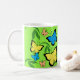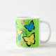 Yellow and blue butterfly design with decorative stylized leaves on a light green background