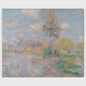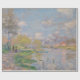 Spring by the Seine by Claude Monet, oil on canvas 1875, is a landscape painting of pedestrians strolling on the banks of the River Seine in Paris, the warm green leaves of budding trees and puffy white clouds in the pale blue sky of a warm, sunny day reflected in the river. Painted in loose, sketchy, rapidly applied strokes of oil color, the picture captures a relaxed, leisurely moment in the life of the city, with the atmosphere, color and light under the sun of a spring day. Monet creates a harmonious composition of man amidst nature, using simple shapes and careful color harmony to evoke an idyllic scene typical of the outlook of the French Impressionists.