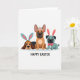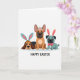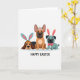 This card features three stylized dogs on a white background, dressed up for a spring celebration with a sweet, friendly closeness between them 🐰. On the left, a brown-and-black long-eared hound reclines with a calm, content look, wearing tall light-blue headwear with pink inner accents that resemble bunny ears. In the center, a tan dog sits upright with alert ears and a soft, attentive gaze, topped with a ring of bright pink flowers that adds a gentle, affectionate touch. On the right, a small teal-gray dog with a darker muzzle and big, shining eyes leans into the group’s energy, finished with a red bow tie and matching pink-lined bunny-ear headwear 🐇. The trio’s wide-eyed expressions and slight head tilts make it feel like they’re sharing a quiet moment together, like close friends posing for a photo. Any greeting text is placed near the top in light pink, with a smaller line beneath it in pale blue to keep the focus on the characters. Light blue and pink accents repeat across the ears and flowers, while the red bow tie stands out sharply against the teal-gray fur.
