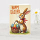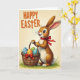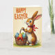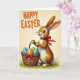 This design shows a friendly long-eared bunny 🐰 standing at the center, with warm brown fur, a crisp white belly, bright eyes, and a small rosy nose above fine whiskers. A deep red ribbon is tied at its neck, and the bunny’s gentle smile and relaxed stance give the scene a sweet, companionable feel, like it’s bringing a treat to someone special. It holds a woven brown basket close to its body, as if offering it with care. Inside the basket are decorated eggs in sky blue, sunny orange, and fresh green, each dotted with small white polka dots, adding a cheerful rhythm of color. A smaller red bow sits on the basket, echoing the neck ribbon and tying the details together. The bunny stands on a narrow strip of green grass against a soft creamy-yellow background, like a warm spring afternoon 🌷. Near the top, a celebratory message appears in orange polka-dotted letters, centered above the illustration. The basket weave is shown with fine texture, and light shading along the bunny’s fur gives the figure a softly rounded look.