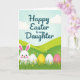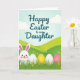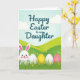 This card features a soft gradient sky shifting from light to deeper blue, with pale clouds drifting near the top. Centered in the upper sky is a flowing teal message in cursive-style lettering, spaced comfortably so it feels airy and affectionate. Below, rounded green hills layer into the distance, creating a calm outdoor setting that suggests a quiet walk together. In the foreground, tall green grass is sprinkled with tiny yellow star-like dots and small white flowers 🌷. A cute white bunny-like character peeks up from the grass with pink-lined ears, bright black eyes, rosy cheeks, and a little red heart-shaped nose, as if looking up at someone with gentle fondness 🐰. Nearby, smooth egg shapes in white, sunny yellow, and soft pink rest among the blades, catching light with subtle highlights. The outlines stay crisp and the colors remain soft, with the bunny’s ears and the pastel eggs standing out against the green field. A few eggs sit slightly tilted in the grass beside tiny white blossoms and yellow specks.