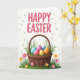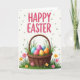 This greeting card shows a spring scene with a brown woven basket sitting near the bottom center, its braided texture drawn in fine detail. Inside the basket, smooth oval eggs in blue, pink, yellow, orange, and purple rest in tufts of green grass, their slight shine making them look freshly set out. Around the basket, scattered blades of grass and small five-petaled flowers in bright pink and sunny yellow create an outdoor setting that feels like a gentle invitation to linger 🌷. The arrangement feels friendly and affectionate, like a small shared surprise left for someone you care about, with the elements leaning together in a cozy cluster. Across the top, a large curving greeting appears in warm magenta, taking up most of the upper space and drawing the eye first. Behind the text, the background stays soft off-white with muted olive-green polka dots sprinkled loosely for a light, festive touch 🐰. The lighting is even and bright, keeping edges crisp from the basket’s rim to the flower petals and the dotted backdrop.
