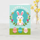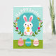 At the center of the card is a plump white bunny with wide, gentle eyes, soft pink inner ears, and rosy paw pads, smiling as it cradles a shiny golden egg 🐰. A leafy wreath of curling green vines wraps around the bunny like an affectionate hug, dotted with tulips in fuchsia, sunny yellow, and warm orange that feel like a bouquet offered with care 🌷. Across the top, white lettering curves in an arc, standing out clearly against the sky-toned background. Behind the wreath, the scene fades from a light blue sky into a green grassy field, giving the design an open, outdoor spring setting. The bunny’s relaxed posture and tender, attentive gaze toward the egg add a sweet, friendly romance to the moment, like sharing a small treasure with someone close. Near the bottom, three decorated eggs sit in the foreground: one rose-colored with dots and stripes, one teal with zigzag patterns, and one creamy white with floral motifs and wavy lines. The colors stay soft and bright, with smooth shapes and neat edges that keep everything easy to take in. The tulips cluster along the wreath while the three patterned eggs line the lower edge against the green grass.