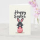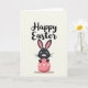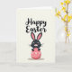 This card features a stylized dark-furred bunny peeking over a large coral-pink oval, like an egg, with a shy, friendly look 🐰. The bunny’s long ears have soft pink inner sections, and a tiny pink nose sits above fine whiskers, giving it a gentle, affectionate expression. Its wide eyes face forward as if making warm eye contact, like a quiet hello between close friends. The coral oval is decorated with small white polka dots and four neatly tied white bows spaced across the surface, adding a sweet, gift-like touch. The background is a light cream tone, keeping the scene airy and calm. Near the top, a seasonal greeting is written in black, placed above the bunny’s head so the words feel like they’re floating over the scene 🌷. A soft shadow sits just under the coral oval, and the white bows and dots stand out sharply against the pink.