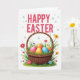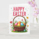 This design shows a woven wicker basket resting in thick green grass, holding glossy eggs in rose pink, sunny yellow, warm orange, and soft sky blue. Around the basket, small wildflowers in fuchsia, golden yellow, violet, and cornflower blue lean inward as if gathered close together, adding a gentle, friendly closeness to the scene 🌷. The eggs sit snugly side by side, their smooth shine giving the arrangement a tender, cared-for look. Above the illustration, a short holiday greeting appears near the top in deep red lettering, standing out clearly against the lighter background. The background is a pale aquamarine field sprinkled with faint, translucent circles that float like soft light spots. The basket’s earthy tan weave contrasts with the cool colors of the eggs and the fresh greens below, keeping the scene bright without feeling busy 🐰. Tiny petals and blades of grass frame the bottom edge, with the flowers clustered most densely around the basket’s base. The pale aquamarine backdrop shows scattered, see-through circular highlights behind the red greeting text.