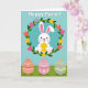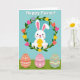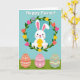 This greeting card features a fluffy white bunny with long ears, rosy cheeks, and a gentle smile as it cradles a glowing golden egg 🐰. A leafy green wreath circles the bunny, dotted with small blossoms in pink, yellow, orange, and lavender that feel like a sweet bouquet offered to a close friend. Behind the wreath, the background is split into sky blue above and deep green below, like a calm spring field meeting open air. Near the top, a short holiday greeting sits above the wreath in a light, easy-to-read font, colored in a soft pastel shade that stands out without shouting. The bunny’s relaxed posture and tender gaze toward the egg add a cozy, affectionate touch, as if it’s holding a small gift meant for someone special 🌷. Along the bottom foreground, three decorated eggs rest side by side, each with white patterns that look carefully painted. One egg is coral with dots and tiny flower shapes, another is soft rose with zigzags and little blooms, and the third is muted sage green with wavy lines and slim stripes.