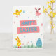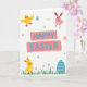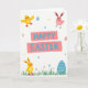 This card features a bright Easter greeting centered in the design, outlined in medium blue and set across two soft coral brushstroke-style banners. Around the text, a white background keeps the scene airy while a few tiny cross-shaped sparkles add a gentle twinkle 🌷. In the upper left, a small yellow chick with rosy cheeks lifts its wings as if fluttering toward the message, like it’s eager to join in. In the upper right, a rounded pink bunny with long ears leans inward, giving the layout a friendly, companionable feel 🐰. Along the bottom, a strip of fresh green grass grounds the scene, and a second yellow long-eared animal peeks up with a tender, curious look as if meeting the bunny’s gaze. Scattered between them are decorated egg shapes in soft blues and pinks, some with simple stripes that add texture without crowding the space. The coral banners have slightly uneven edges, and the blue-outlined letters sit neatly across their centers.