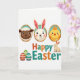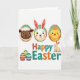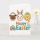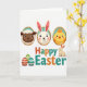 This card features a spring-themed digital illustration with three oval-framed portraits lined up near the top, each inside a golden oval with a teal inner border. In the first frame, a dark-faced lamb with fluffy white wool looks forward with a friendly, steady gaze, as if posing for a keepsake. Next, a white long-eared bunny with rosy cheeks tilts slightly, giving a tender, companionable look 🐰. The third portrait shows a small yellow chick with a tiny orange comb, bright-eyed and cheerful, completing the trio. Centered below the portraits, the words “Happy Easter” appear in large letters, alternating orange and teal, stretching across the middle of the design. On the right side of the text, a small cream-colored bunny sits upright as though watching the greeting, while on the left three decorated eggs display horizontal stripes in red, lime green, and aqua 🌷. The background is plain white, with soft shading around the characters and crisp outlines around the ovals, eggs, and lettering.