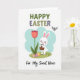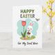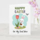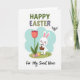 Designed with a springtime scene in soft pastels, this card features an upright white bunny 🐰 in the lower half, with fuzzy-looking fur, pink-lined ears, and rosy cheeks as it holds a small woven basket close like a treasured gift. A single coral tulip 🌷 rises to the bunny’s left from leafy green stems, leaning slightly toward it as if sharing a quiet, friendly moment. The main illustration sits inside a rounded, cloud-like shape in pale blue, floating against a bright white background that keeps everything airy. Along the bottom, several oval eggs are scattered in lavender, golden yellow, and pale pink, decorated with stripes and tiny speckles for a gentle hunt-like feel. Near the top, a festive greeting is placed in mixed leafy green and muted violet lettering, centered above the scene. Close to the greeting, a small winged oval accent hovers like a light ornament. Beneath the picture, a smaller line of text appears in a darker ink tone, tucked neatly under the bunny and tulip. The bunny’s wide eyes face forward while the tulip’s coral petals open beside it, with patterned eggs resting across the lower edge.