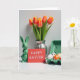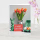 This greeting card shows a spring tabletop scene set against a bright white background, arranged with a calm, close-together feel like friends leaning in for a photo. On the left sits a glossy green ceramic bunny with upright ears and a relaxed face 🐰. Just beside it, a red card stands upright with a short Easter message centered in small white letters, drawing your eye like a quiet note passed between loved ones. Behind them, a bouquet of tulips rises from a fluted silver vase, with petals shifting from orange to soft yellow and green stems filling the space with fresh color 🌷. On the right, a pale green carton holds decorated eggs, mixing black dots, orange spots, and simple stripes that look carefully chosen rather than rushed. Soft, diffuse light smooths the surfaces and adds gentle highlights to the ceramic, the vase, and the egg shells, keeping the arrangement tender and inviting. The eggs sit snugly in the carton, each pattern clearly visible against the pastel green edges.