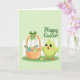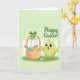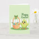 Designed with a soft pastel green background, this spring scene sets a gentle, friendly mood with 🌷. On the right stands a small lime-green bird with fluffy feathers, wide eyes, and rosy cheeks, holding its wings slightly open as if leaning in for a warm hello. To the left, a woven basket sits close by, and the pairing feels like sweet companionship, as though the bird is proudly showing off a shared surprise 🐰. A crisp green ribbon wraps the basket and forms a neat bow, while inside are several decorated egg-shaped treats in blue, pink, yellow, green, and orange with simple patterns. Behind them, a white picket fence stretches across the scene, suggesting a quiet garden corner. A seasonal greeting appears near the top in flowing deeper-green lettering, standing out clearly against the pale background. In the foreground, a strip of green grass runs along the bottom edge with a small yellow flower near the basket.