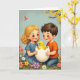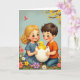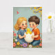This design shows two small children in a spring meadow, kneeling close together as they lean in with matching, curious smiles. A light-haired girl in a blue dress with white dots faces a dark-haired boy in an orange top, and their shoulders nearly touch in a quiet, friendly closeness. Between them, they carefully hold a cracked egg as a tiny yellow chick peeks out, drawing their eyes to the same bright point of discovery 🌷. Around their knees, a thick spread of wildflowers in red, purple, gold, and white fills the ground like a natural rug. In the open space near the top, a short Easter greeting sits centered in soft pastel lettering, with smaller words tucked just beneath it in a lighter shade. The sky behind them is pale blue, and the gentle lighting gives their cheeks a warm blush while keeping the scene calm and airy 🐇. A thin branch with small yellow blossoms stretches in from the upper right, while a single red bird glides across the upper left.