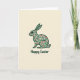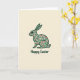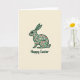 Designed with a springtime feel, the card features a long-eared rabbit silhouette centered on a soft cream background 🐰. Inside the rabbit shape, deep green leaves and curling vines weave together like a little garden, giving the scene a tender, close-knit mood, as if nature itself is leaning in for a gentle hug. Small red blossoms are scattered among the greenery, adding warm accents that suggest affectionate little notes exchanged between friends. Tiny light-blue dots appear here and there, like quiet glimmers that make the pattern feel lively without being loud 🌷. A dark green outline defines the rabbit’s curves, giving the figure a crisp, graphic look. Beneath the illustration, a short Easter greeting sits centered in deep green text. The cream backdrop stays open and uncluttered, so the leafy rabbit and its red flowers stand out clearly.
