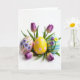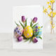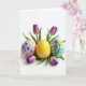 This greeting card shows three decorated eggs arranged like close friends leaning in together on a bright white background, surrounded by spring flowers 🌷. The left egg is a soft rose color with green sprigs and raised violet-blue blossoms, each with a tiny yellow center that feels like a gentle gift placed with care. Next to it sits a sunny yellow egg dotted with small pink circles, adding a light, cheerful contrast. On the right, a striped egg alternates calm blue and leafy green bands, topped with textured flower shapes in deep purple and warm yellow for extra dimension. Behind the eggs, two closed tulip buds in dusky purple rise on slim green stems, framing the trio like quiet companions. Two more tulip buds rest in the foreground, angled slightly toward each other as if sharing a private moment 🐇. The greeting appears near the top in a soft pastel tone, while the lower edge stays mostly open, letting the purple buds and green stems stand out against the white space.