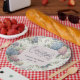 Elegant wedding paper plates featuring delicate hydrangea flowers in shades of dusty rose, light purple, and blue.