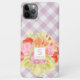 Contemporary blush pink, coral orange red, light green, and light pastel pink floral watercolor on a pastel pink and white colored gingham plaid. With room to customize or personalize with a name monogram or initial of your choice. Beautiful, modern, and cool cover for the trend-savvy and art-loving hip trendsetter, artsy motif lover who wants to protect their phone from dust and dirt, wear and tear. This design is available in Apple iPhone 6, 7, 8, 10 or X, XR, XS, 11, 12, 13, 14 Mini, 15 Plus, and Pro Max cellphone cases. Show off your style, look fashionable, and feel stylish with a unique design on a mobile device accessory of your choice.