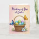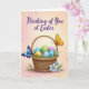 Designed with a soft spring scene, the illustration centers on a woven basket filled with pastel eggs in blue, green, yellow, and purple. Fresh green grass and small white daisies with golden centers rise from the basket, giving the arrangement a gentle, cared-for look. Two butterflies add a sweet sense of closeness—one in blue and violet hovering to the left, and another with golden wings and an orange body resting on the right side of the handle as if pausing near a friend. A light blue flower sits at the base of the basket, its petals angled upward like it’s leaning in toward the display 🌷. Across the upper area, the message “Thinking of You at Easter” appears in flowing purple lettering, centered and easy to spot. Behind everything, a smooth gradient shifts from blush pink to creamy peach, sprinkled with tiny golden specks that catch the eye. The basket’s braided handle curves over the eggs, with the golden-winged butterfly perched neatly along its top edge 🐇.