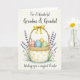 The front design shows a centered woven basket brimming with decorated eggs, lit by a soft spring glow that feels like a gentle invitation to draw closer 🐰. A golden-yellow bow sits at the top, and the basket’s lower edge features white with sunny yellow polka dots, adding a sweet, cozy touch. Inside are four pastel eggs—rosy pink with horizontal bands, sky blue with vertical stripes, warm yellow with subtle waves, and leafy green with a mix of dots and lines—nestled together like close friends. On both sides, tall lavender sprigs rise with fresh green leaves, and tiny star-shaped fuchsia flowers tuck in around them 🌷. A light blue shadow beneath the basket grounds the scene and makes the centerpiece stand out. Curved, handwritten-style lettering appears above and below the illustration in a dark ink, framing the artwork like a quiet note shared between two people. The lavender stems lean inward toward the basket, and the small fuchsia blossoms cluster near the base on either side.